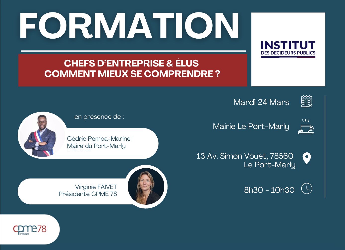 👨‍🏫 Intervenants : Virginie Faivet, présidente CPME78, et Monsieur Cédric Pemba-Marine, maire de Port-Marly