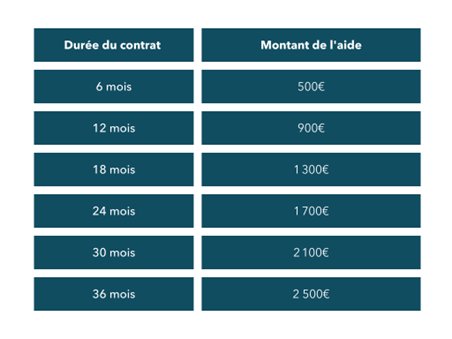 Le montant maximum de l’aide est de 3 150 €. L’aide peut être mobilisée en amont du recrutement (préparation à l’intégration) et durant le contrat (dans les 9 mois qui suivent la prise de poste).