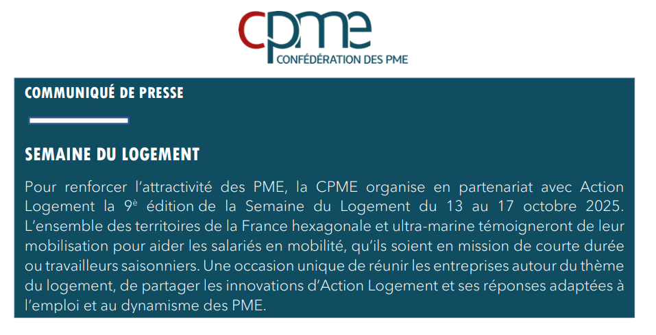 La CPME nationale et ses 13 Unions régionales et des Départements et régions d’Outre-mer ont à cœur de les partager avec l’ensemble des entreprises du 13 au 17 octobre 2025. En partenariat avec Action Logement, elles sont fières de convier les chefs d’entreprises à la 9 -ème édition de la Semaine du Logement.